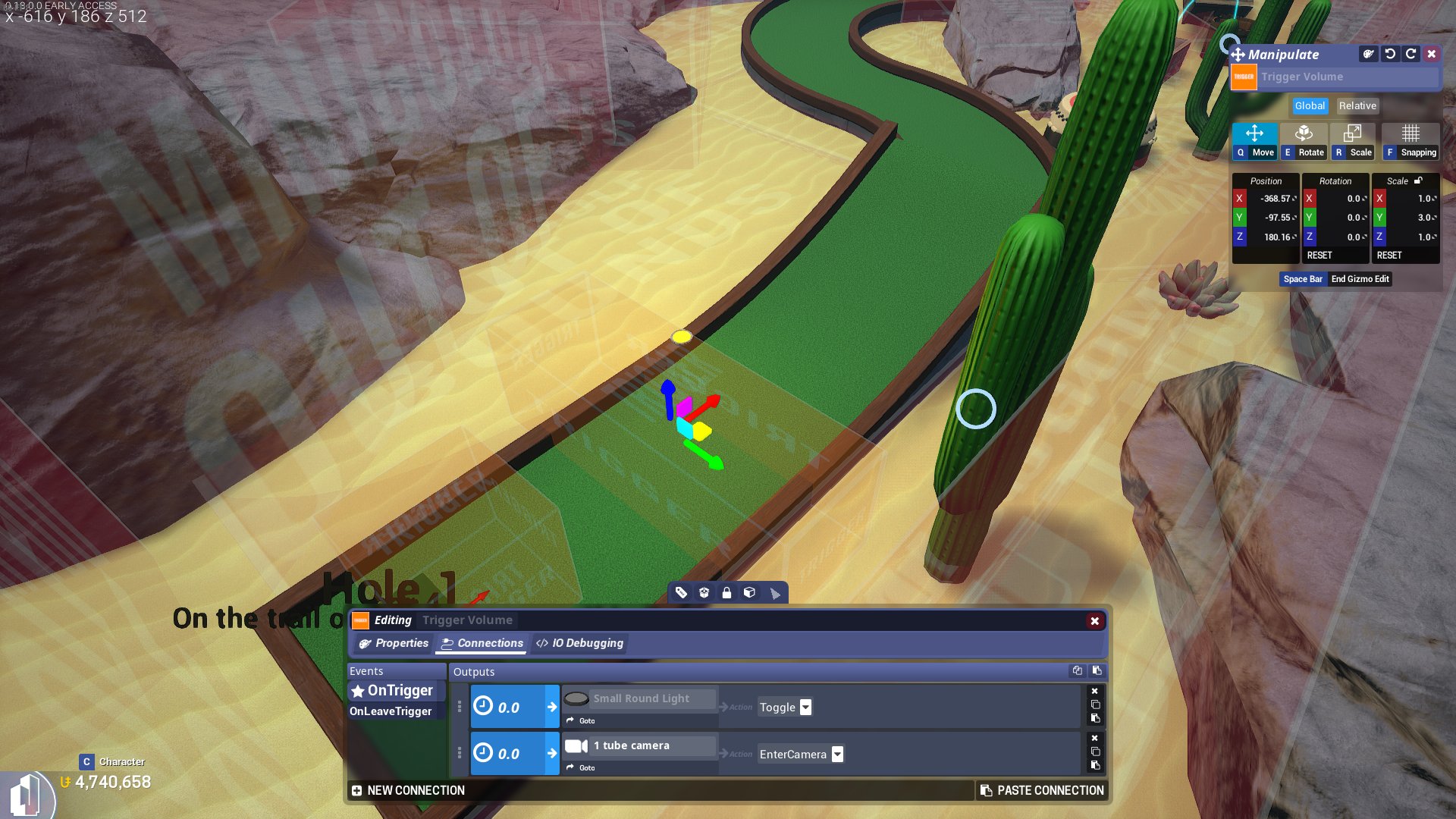 Unfortunatly while setting a trigger connected to a camera IO switches the view to the camera when the player’s toon enters it, this does not happen when the golf ball does. The view does switch to the camera if a ball enters the camera volume, however this is not particularlly helpful in this case, as the view will switch back to the default when the ball leaves the volume.
