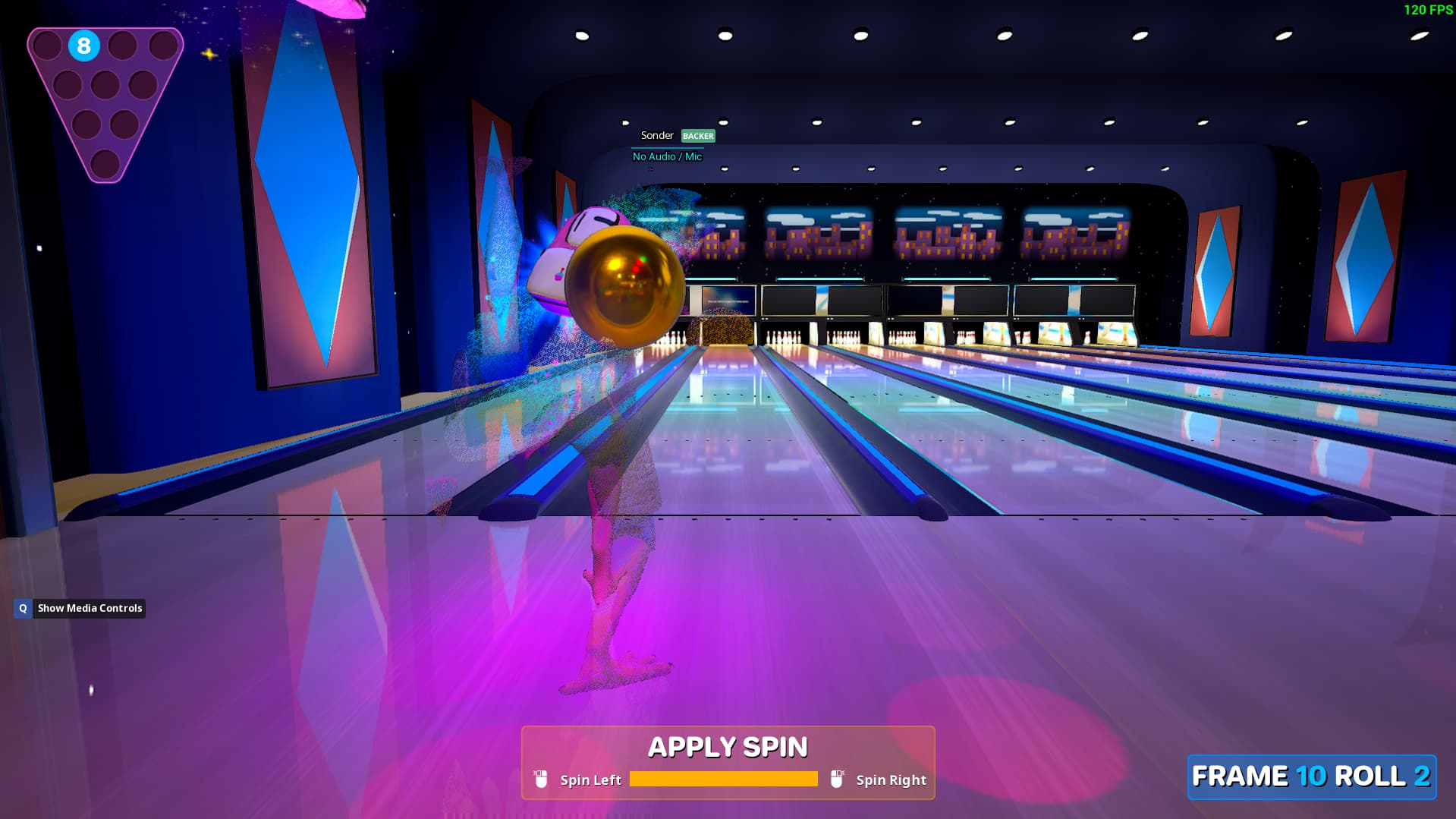 Upper-left indicator shows 8 pin still standing, but no physical pins remain.