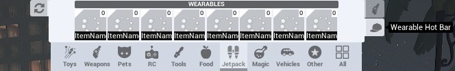 The wearables hot bar should load and show any currently equipped items in it and allow me to equip or unequip them.