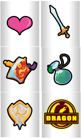 Maybe the spell book is some kind of additional attack you can do, but does more damage and getting 3 swords/magic books will be a crit that does 3x the damage against the monster. The green flask Could be mana buildup that give a slightly better damage output and the dragon would be the ultimate.