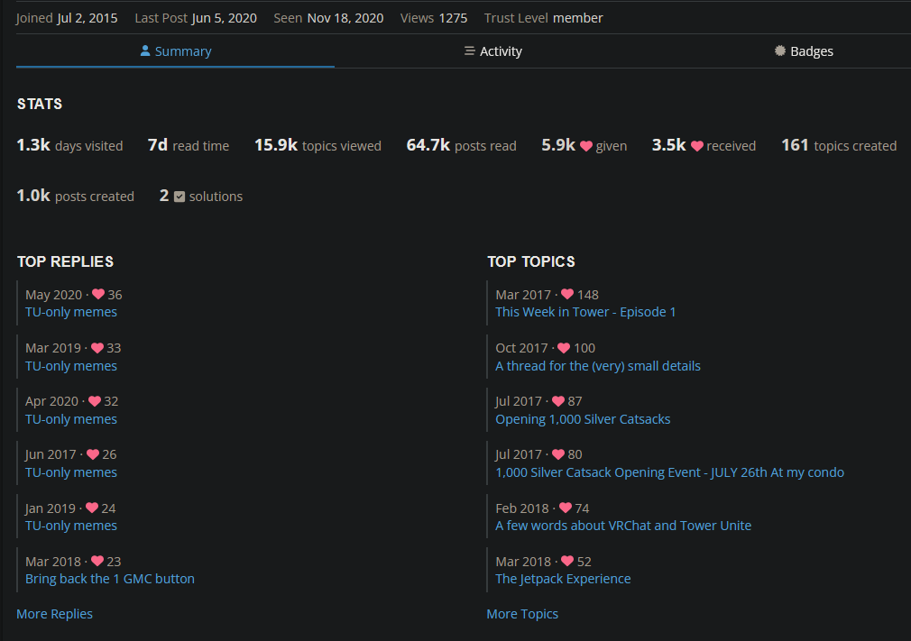 Back in the day, I was quite active on the forums. As a daily user I’d do my best to read every post, and frequently contributed across a broad range of forum topics during Tower’s early and middle-stages of development. Eventually reaching Regular status, I sadly had to delete and anonymize my account due to unrelated IRL personal reasons, and had largely stopped playing Tower altogether around 2020.