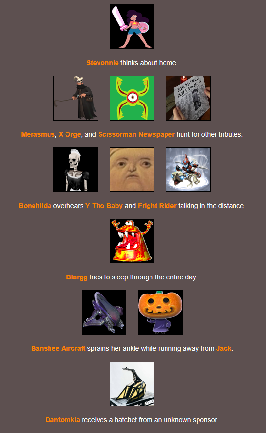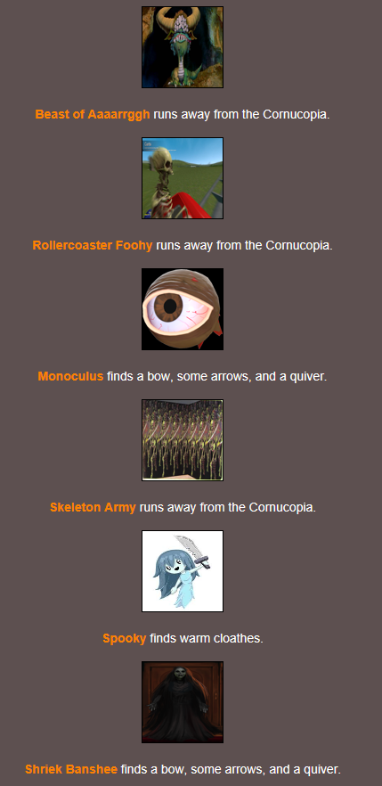 @Blue, Nice events but Clothes and Cornucopia are spelt wrong, and some events include different tributes even though only 1 is mentioned.