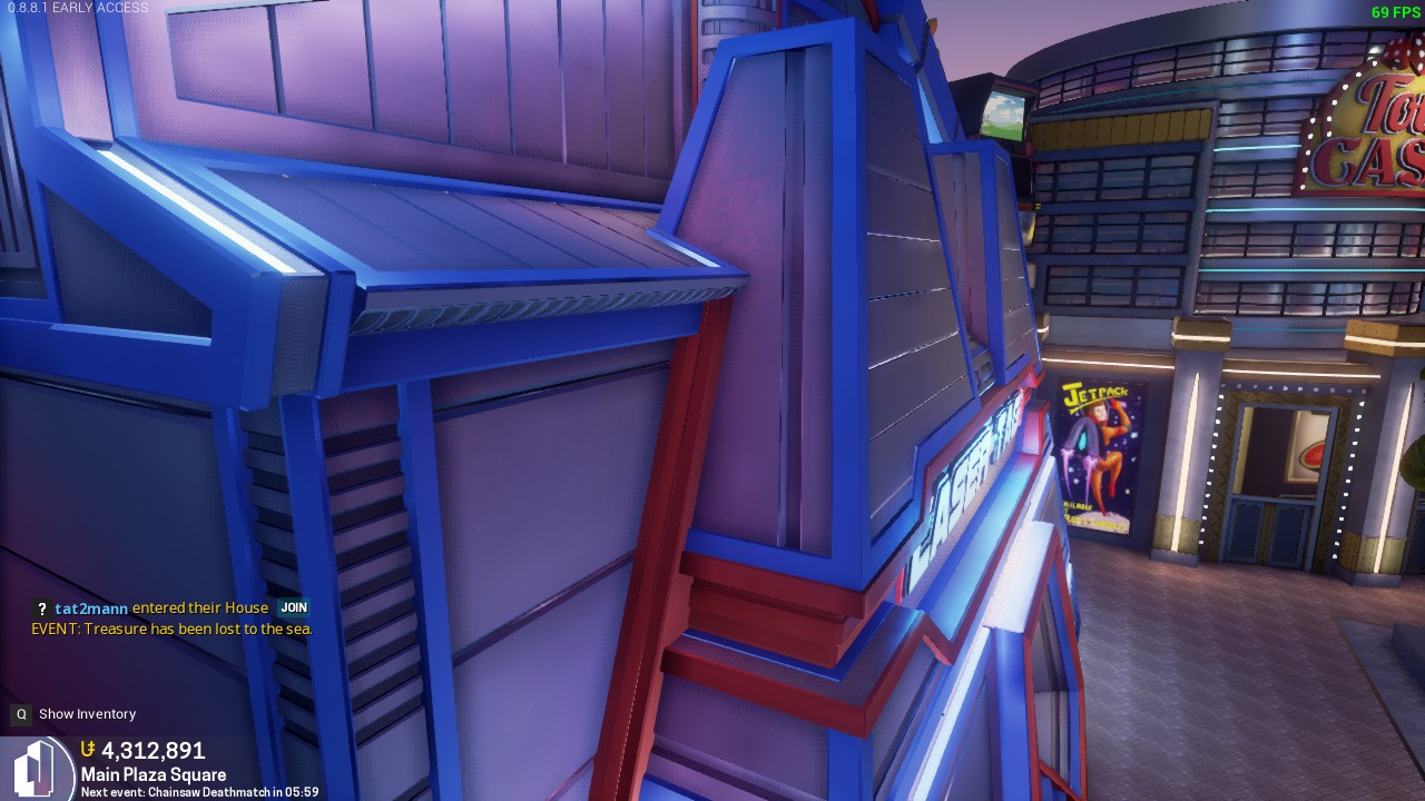 Jumping into this edge of the laser tag building, it will teleport you inside the laser tag entrance (not the waiting room), stuck in the floor, crouch and you will fall through the plaza. The only way to get out is to press K or use a jetpack to fly through the floor.