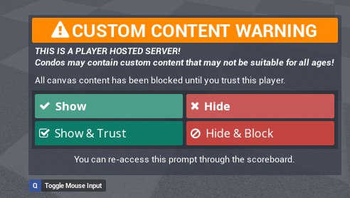 When the player leaves / re-joins, the “Custom Content Warning” prompt won’t re-appear.