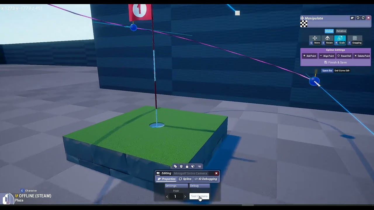 All of the hard work of getting splines working and the camera system culminated in the Minigolf Intro Camera tool. This allows you as the map maker to make custom camera intros for each hole. If one isn’t place, it’ll default to a static camera.
