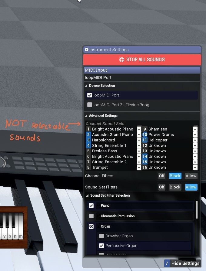 A preview of MIDI settings for musical instrument items. Displayed are the sound sets that are detected for each of the 16 MIDI channels, using ‘program change’ events. This information can be used to select which channels to play back on the active instrument.