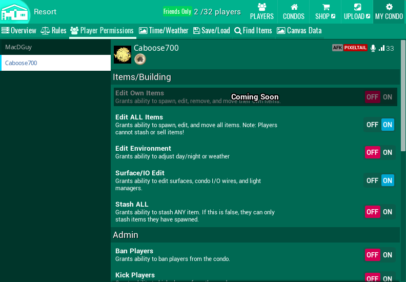 Work has begun on preparing Update 0.12.0.0 for release, which will contain Co-Op condos, allowing a condo owner to authorize their friends to help them build their condo. Co-op condos will contain a permissions system, allowing the condo host to specify what actions an individual is allowed to perform. You can read more about Update 0.12.0.0 here.