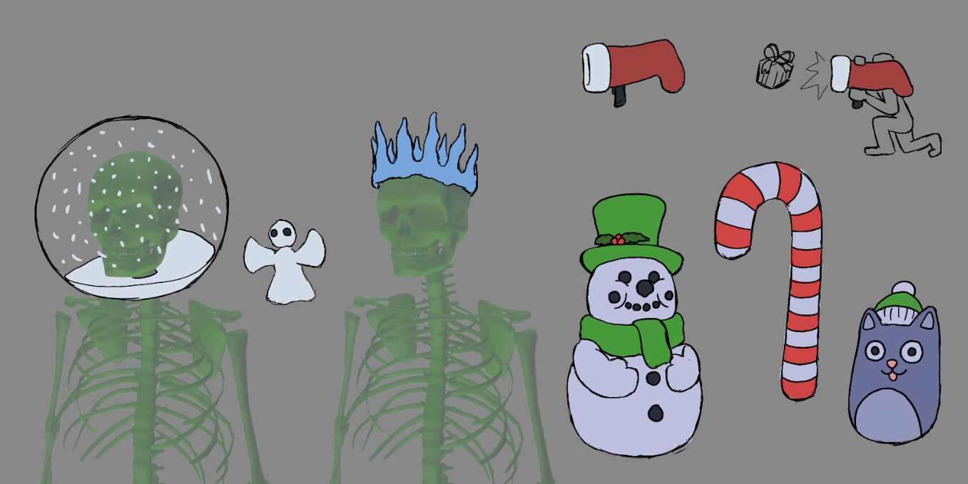 A large stocking held like a bazooka. LMB launches small presents and trinkets, RMB launches a lump of coal.